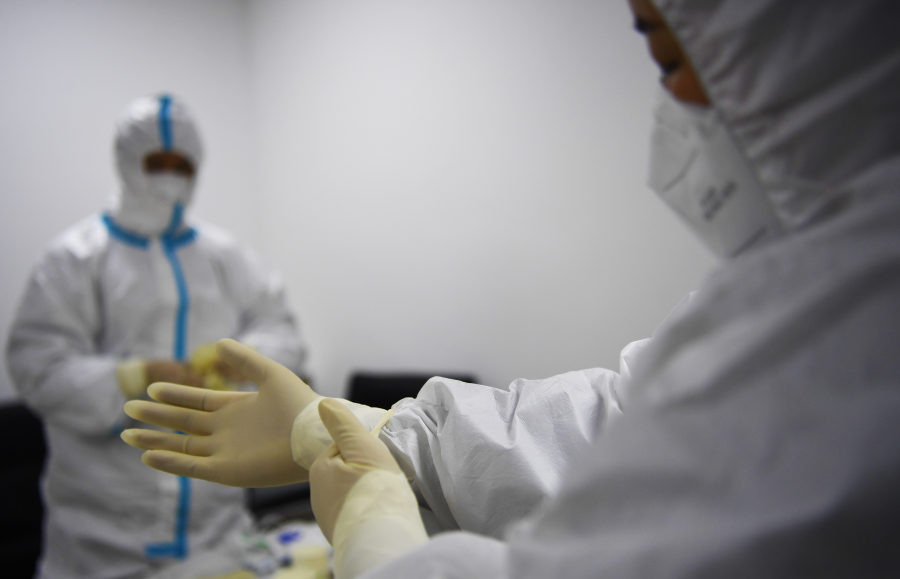 1月8日,郑州市一核酸检测点,医务人员在穿戴防护服。(新华社记者张浩然 摄)