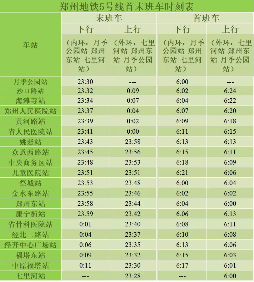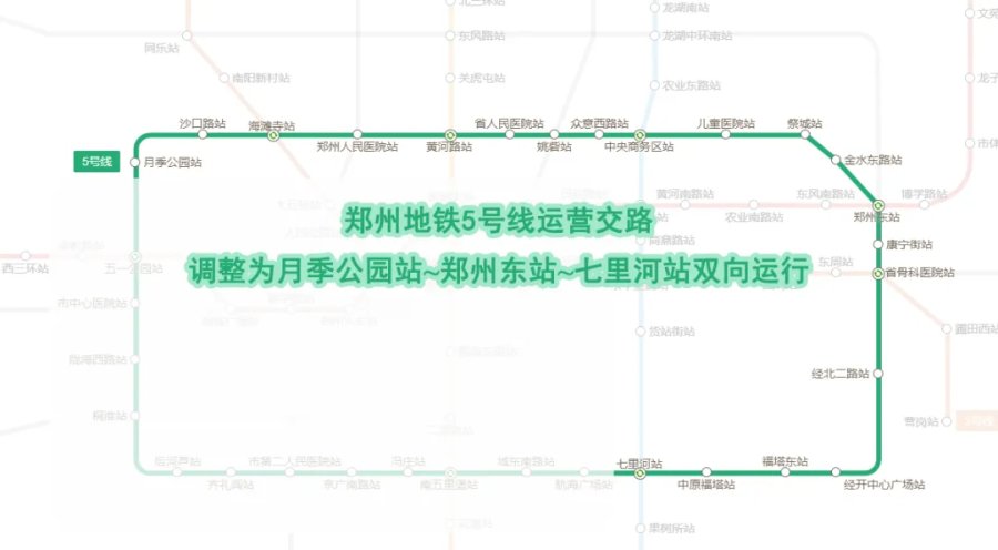 自1月15日起,郑州地铁5号线周末执行工作日运营时刻表,即早晚高峰时段,除月季公园站的行车间隔为15分钟外,其余5号线车站为5分钟;平峰期、低峰期行车间隔为15分钟。因疫情防控工作需要,5号线运营交路为月季公园站~郑州东站~七里河站双向运行,周末首末班车时间与工作日一致。