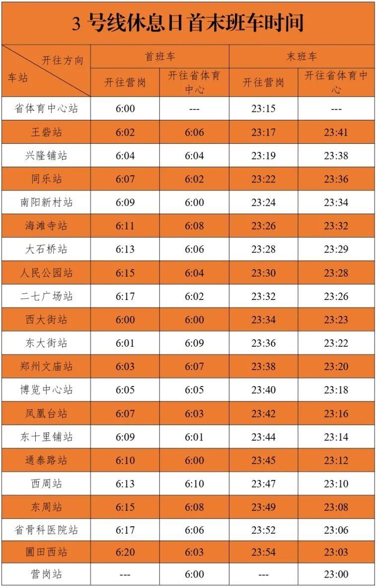 根据目前疫情防控形势,郑州中建深铁3号线结合周末客流及线网接续情况,自2022年1月15日起,郑州中建深铁3号线周末行车间隔由高峰期6分30秒、平峰期8分钟调整为全天10分钟。本次调整不影响运营时长、末班车发车时间,个别车站首班车发车时间有所调整。3号线调整后休息日首末班车发车时间见下表。