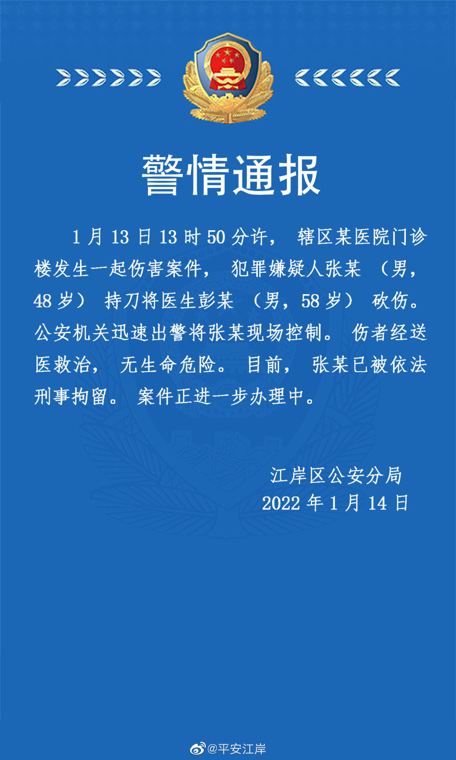 武汉一医生被砍伤,当地警方通报:嫌犯被刑拘