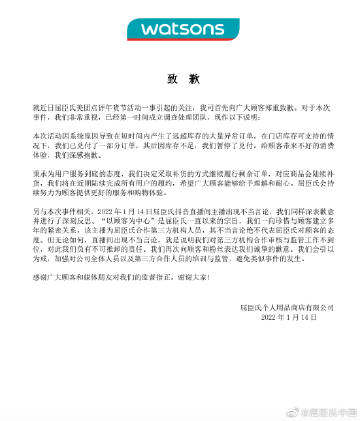 针对抖音直播间主播出现的不当言论,屈臣氏称,该主播系第三方机构人员,屈臣氏将深刻反思并加强对公司全体人员以及第三方合作人员的培训与监管。