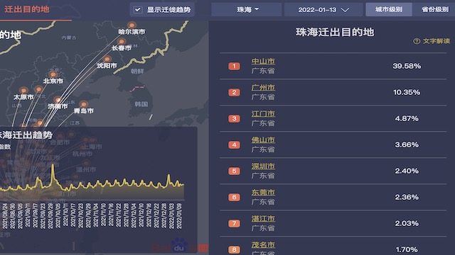 以1月13日为例,珠海迁出人口主要目的地为:中山市,占珠海迁出人口总量的39.58% ;广州市,占珠海迁出人口总量的10.35% ;江门市,占珠海迁出人口总量的4.87%。 排在前10名的目的地还有:佛山市、深圳市、东莞市、湛江市、茂名市、阳江市、惠州市。