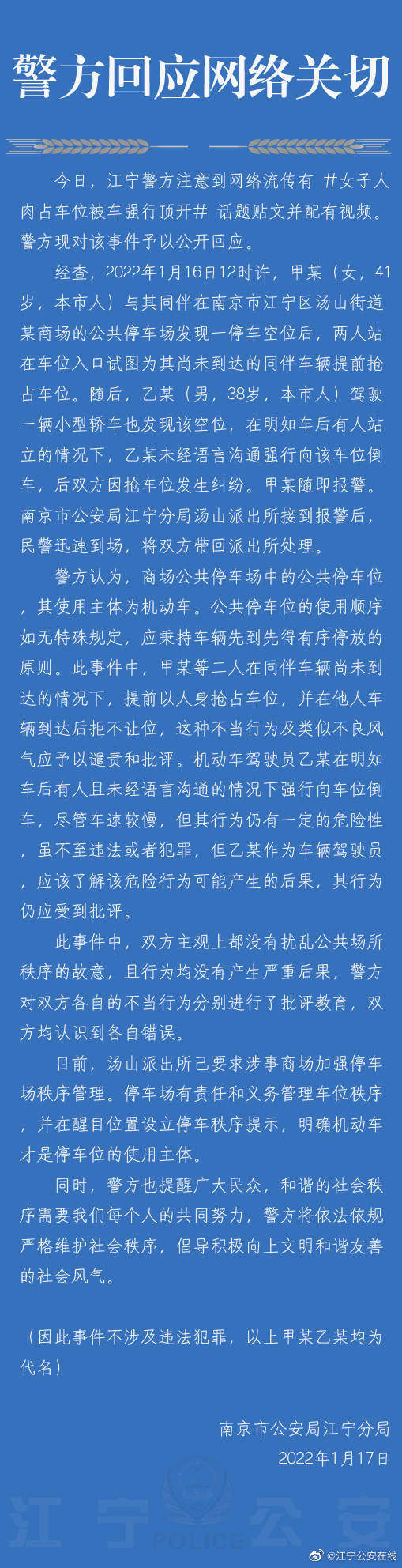 今日(1月17日),南京江宁警方注意到引起广泛关注的女子人肉占车位被车强行顶开相关贴文及视频。警方现对该事件相关调查处理予以公开回应。