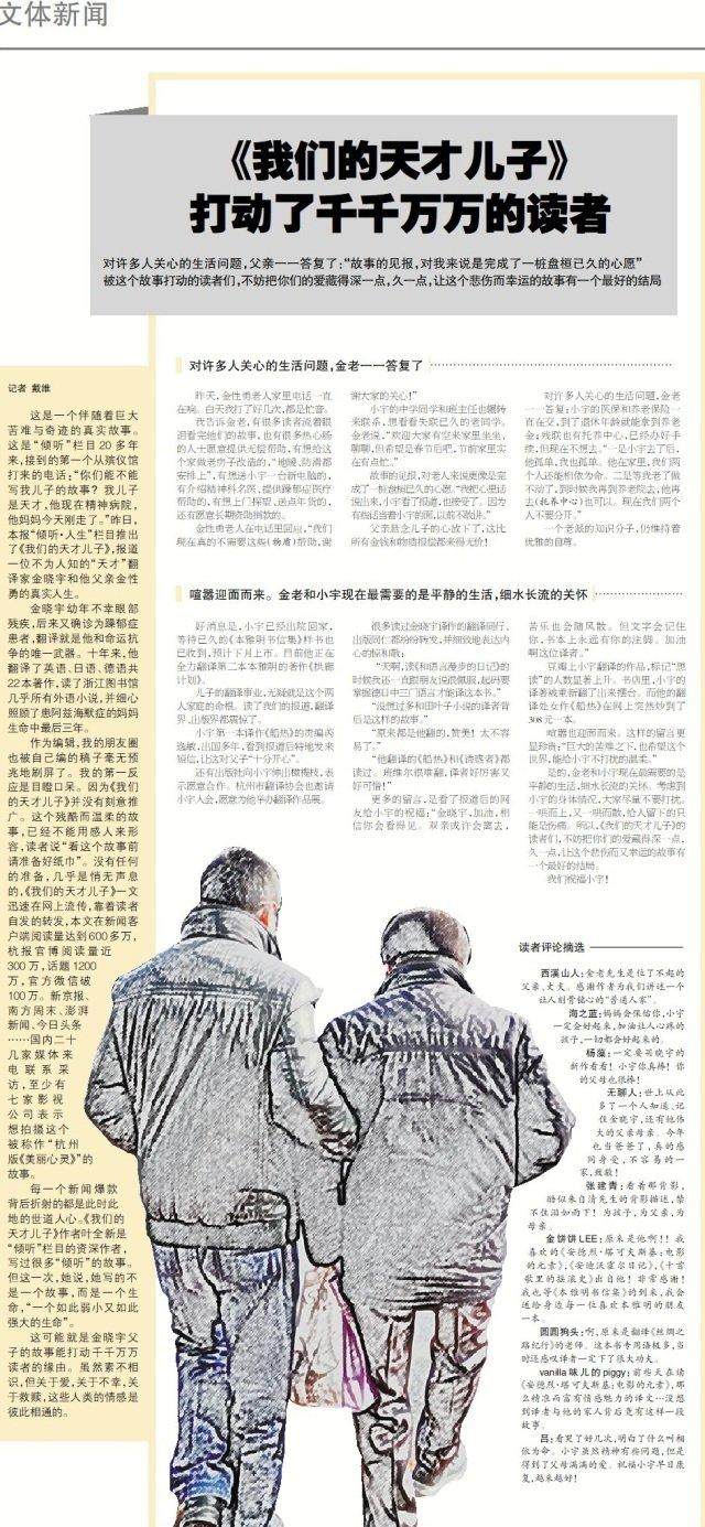 是的,金老和小宇现在最需要的是平静的生活,细水长流的关怀。考虑到小宇的身体情况,大家尽量不打扰。一哄而上,又一哄而散,给人留下的只能是伤痛。所以,《我们的天才儿子》的读者们,不妨把你们的爱藏得深一点,久一点,让这个悲伤而又幸运的故事有一个最好的结局。