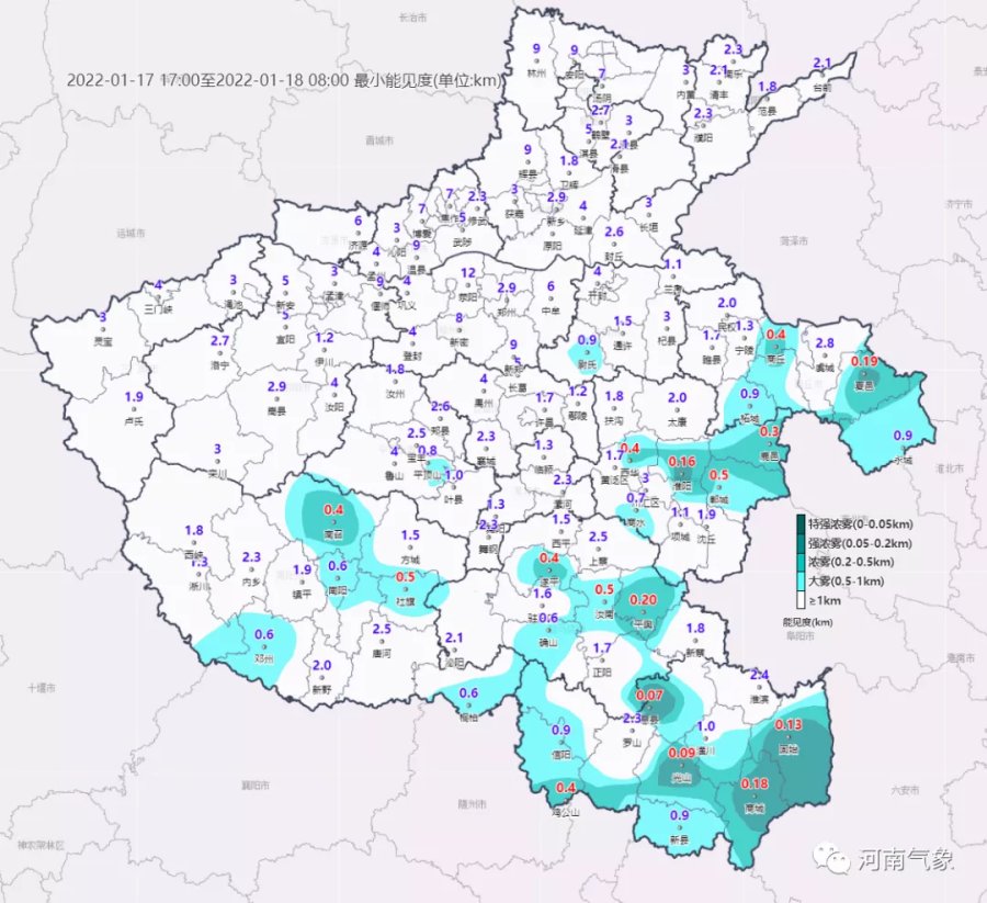 出现能见度低于500米的浓雾
