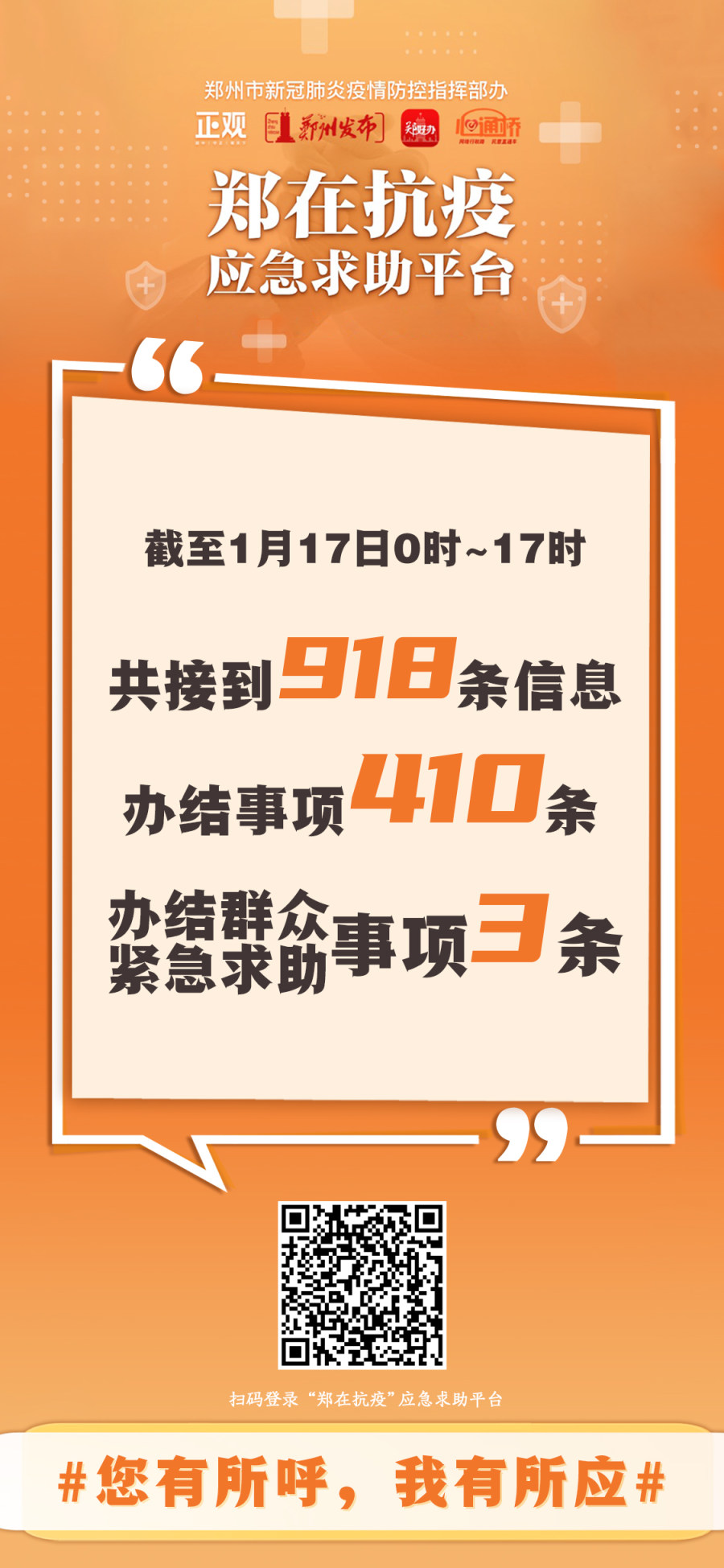 1月18日截至17时,“郑在抗疫·应急求助平台”当日共接到到918条信息(疫情政策类286条、寻医买药类35条、交通出行类76条、健康码问题类425条、食品供应类1条、学生教育类5条、企业服务类12条、其他78条),办结410条,其中办结群众紧急求助事项3条。