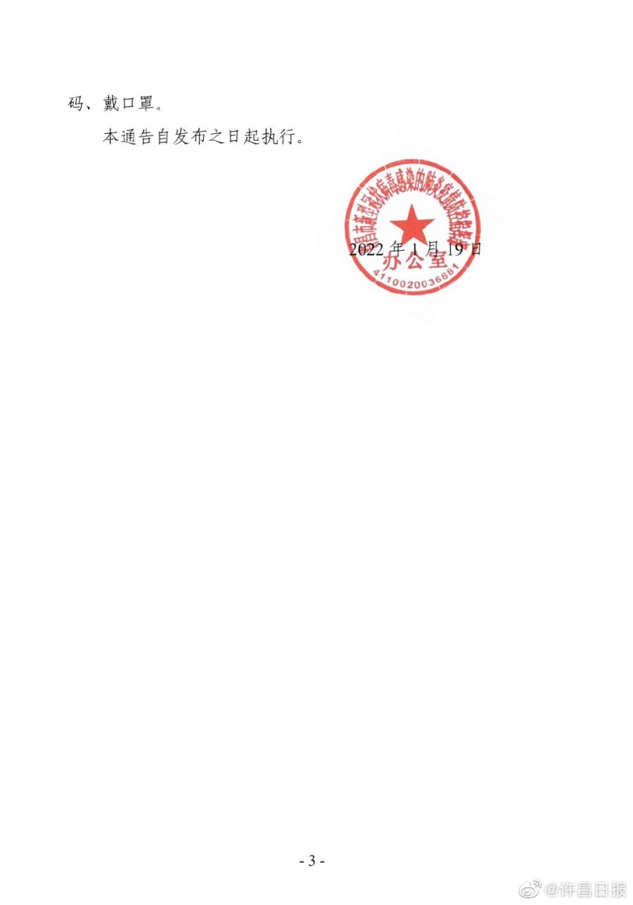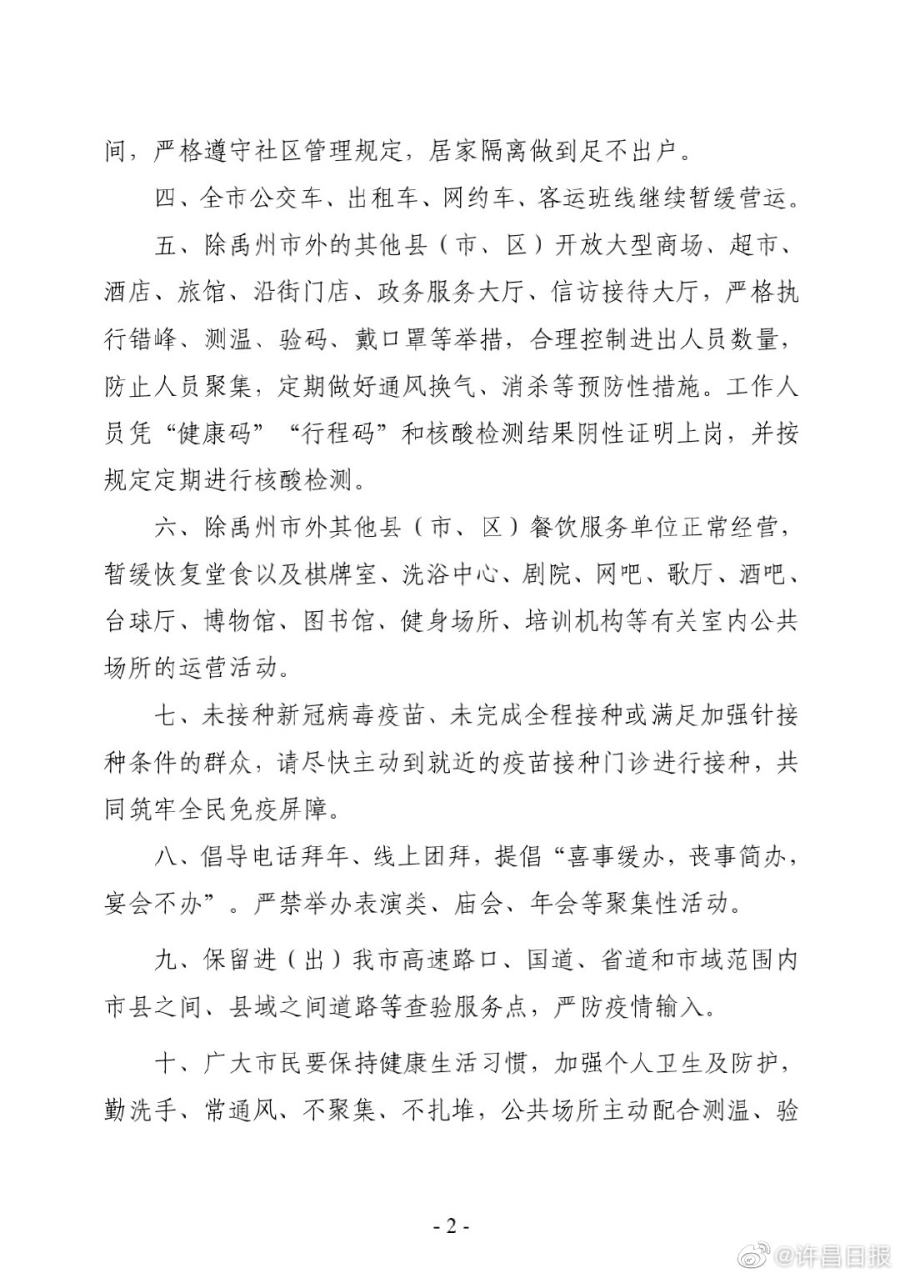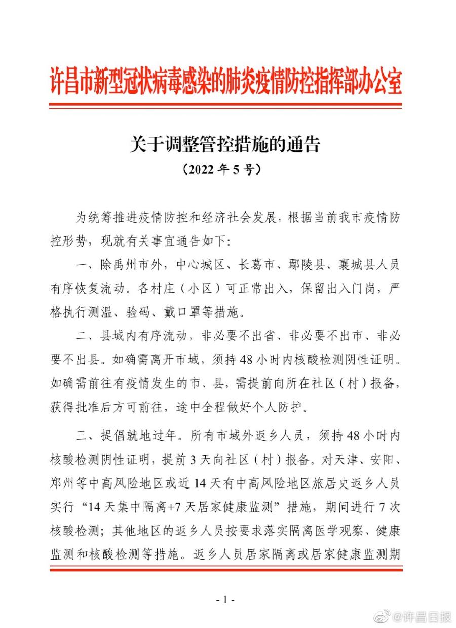 一、除禹州市外,中心城区、长葛市、鄢陵县、襄城县人员有序恢复流动。各村庄(小区)可正常出入,保留出入门岗,严格执行测温、验码、戴口罩等措施。