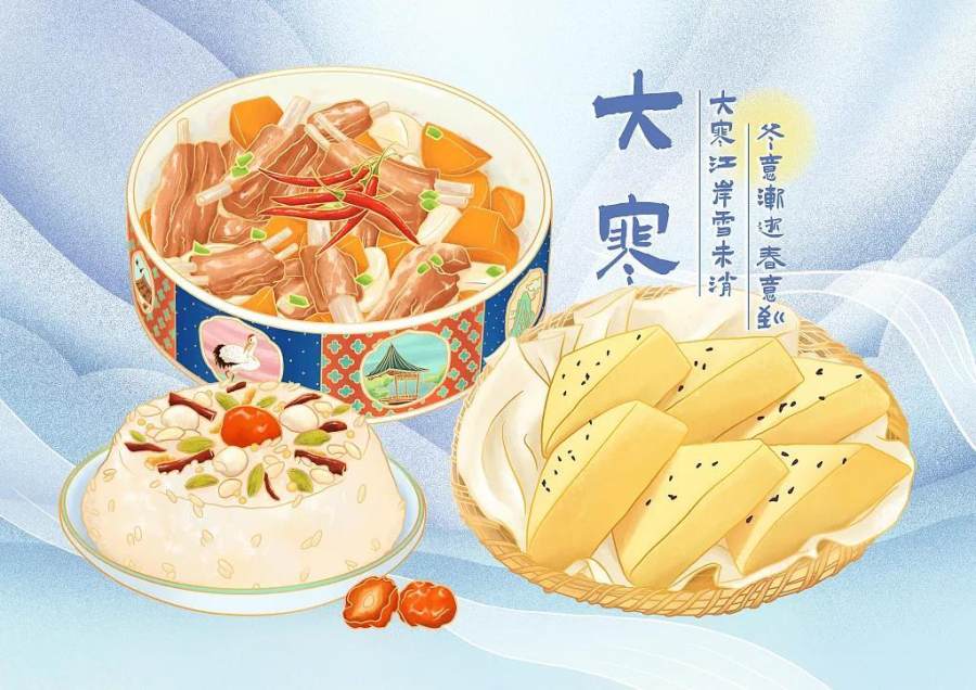 大寒这天,自古有“食糯、打牙祭”的习俗,就是说在大寒这天要吃点糯米做的食物,如糯米饭、年糕、糍粑等;另外也要美美地吃一顿,一锅炖鸡一碗鸡汤,既暖胃又暖心。