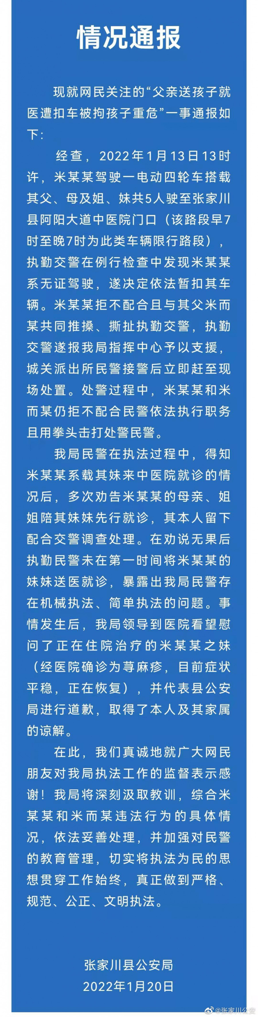 1月20日上午,甘肃@张家川公安发布情况通报:系无证驾驶电动四轮车,家属已谅解。
