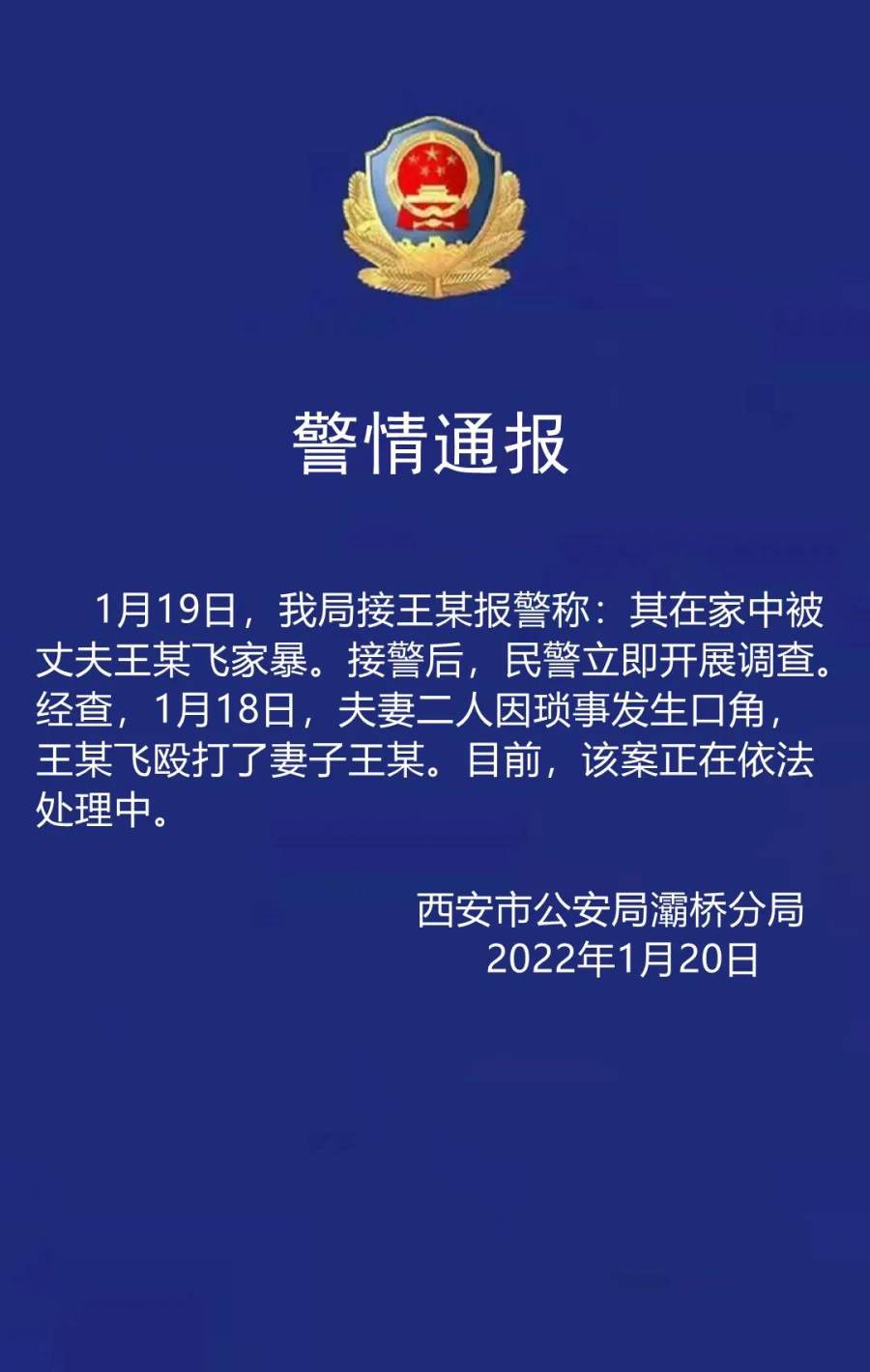 1月20日下午,西安市公安局灞桥分局发布警情通报:1月19日,我局接王某报警称:其在家中被丈夫王某飞家暴。接警后,民警立即开展调查。经查,1月18日,夫妻二人因琐事发生口角,王某飞殴打了妻子王某。目前,该案正在依法处理中。