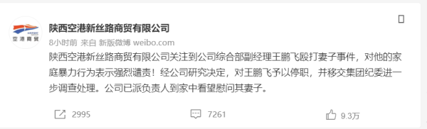 20日凌晨2时许,微博认证为“陕西空港新丝路商贸有限公司”的账号发布消息称,该公司关注到综合部副经理王某殴打妻子事件,对他的家庭暴力行为表示强烈谴责。经公司研究决定,对王某予以停职,并移交集团纪委进一步调查处理。公司已派负责人到家中看望慰问其妻子。