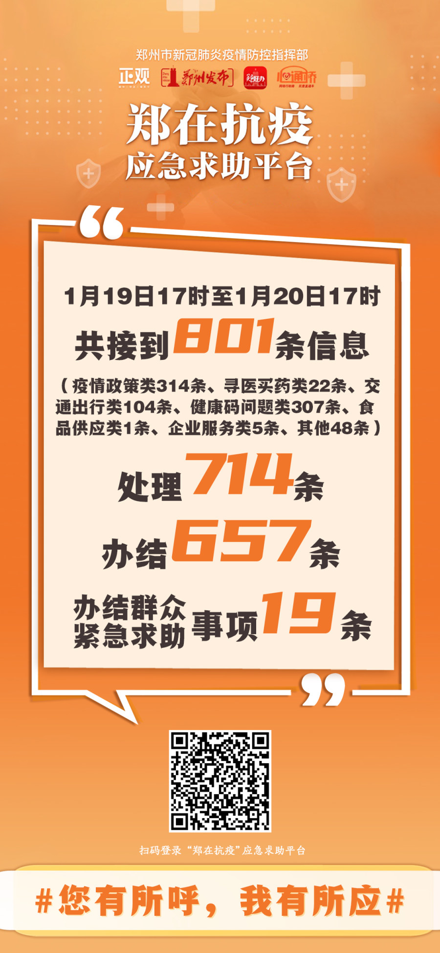 1月19日17时至20日17时,“郑在抗疫·应急求助平台”共接到801条信息(疫情政策类314条、寻医买药类22条、交通出行类104条、健康码问题类307条、食品供应类1条、学生教育类0条、企业服务类5条、其他48条),处理714条,办结657条,其中办结群众紧急求助事项19条。