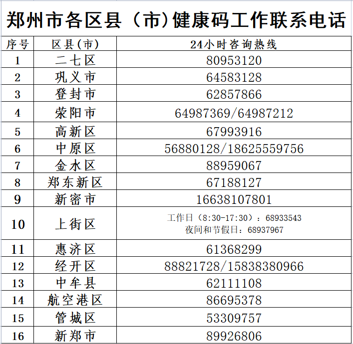 郑州市各区县(市)健康码咨询电话