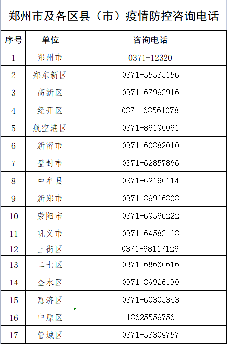 郑州市及各区县(市)疫情防控咨询电话