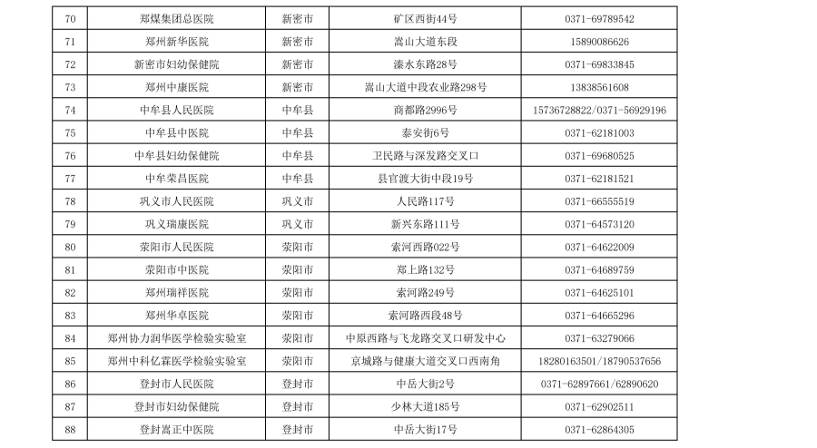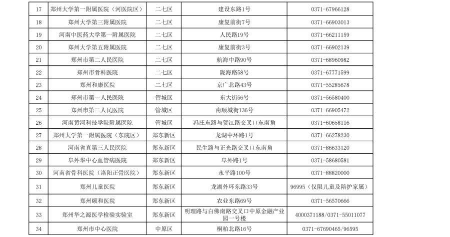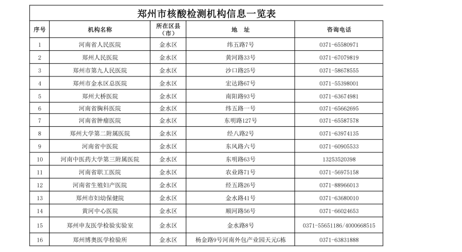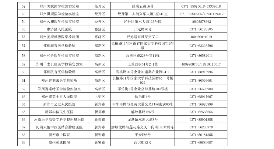 郑州市核酸检测机构信息一览表