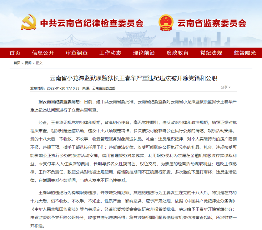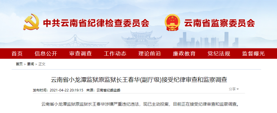 另据云南省纪委省监委网站2021年4月22日通报,云南省小龙潭监狱原监狱长王春华涉嫌严重违纪违法,现已主动投案,目前正在接受纪律审查和监察调查。