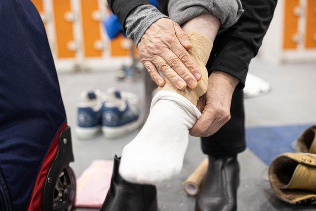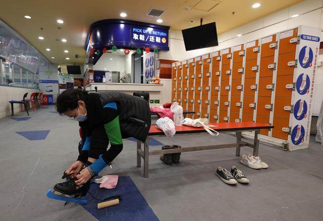 2021年12月16日,曲薇在滑冰前用绷带缠住自己的脚踝。新华社记者 吴壮 摄