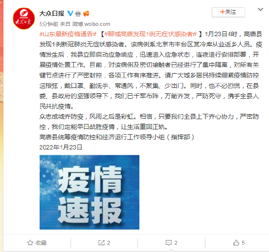 1月23日4时,高唐县发现1例新冠肺炎无症状感染者。该病例系北京市丰台区某冷库从业返乡人员。疫情发生后,我县立即启动应急响应,迅速进入应急状态,连夜进行安排部署,开展疫情处置工作。目前,对该病例及密切接触者已经进行了集中隔离,对所有关键节点进行了严密封控,各项工作有序推进。请广大城乡居民持续绷紧疫情防控这根弦,戴口罩、勤洗手、常通风,不聚集、少出门。同时,也不必恐慌,在县委、县政府的坚强领导下,我们已千军布阵,万箭齐发,严防死守,携手全县人民共抗疫情。
