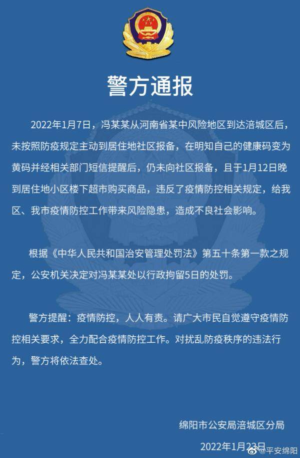 1月23日,四川绵阳市公安局涪城区分局发布通告,男子冯某某从某中风险地区到达涪城区后,未按照防疫规定主动到居住地社区报备,且于1月12日晚到居住地小区楼下超市购买商品,违反了疫情防控相关规定,根据《治安管理处罚法》第五十条第一款之规定,决定对冯某某处以行政拘留5日的处罚。