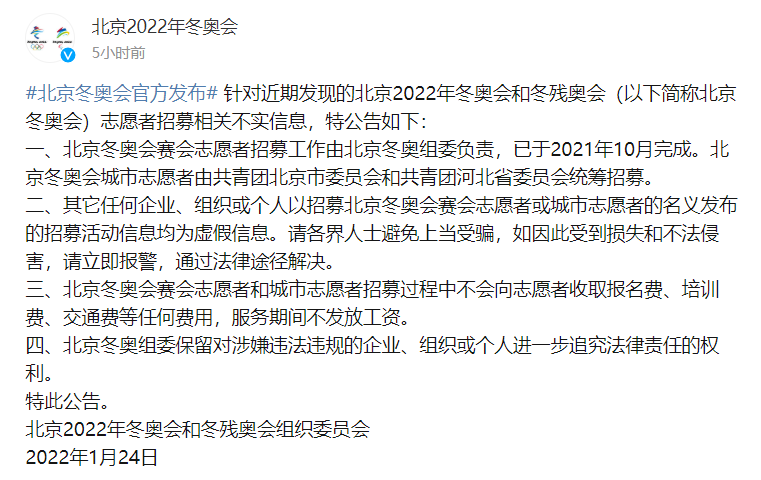 针对近期发现的北京2022年冬奥会和冬残奥会(以下简称北京冬奥会)志愿者招募相关不实信息,特公告如下: