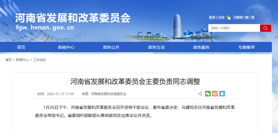 1月26日下午,河南省发展和改革委员会召开领导干部会议,宣布省委决定:马健同志任河南省发展和改革委员会党组书记。省委组织部副部长高树森同志出席会议并讲话。