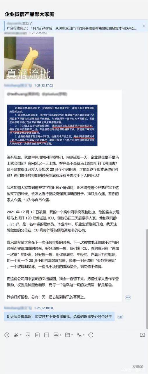 1月26日,腾讯上了头条,因为加班文化。1月25日深夜,腾讯企业微信团队一名入职不久的应届生员工,在部门内部的工作大群中,看到部门发放的“业务突破奖”评语中,提及一获奖员工20小时连续工作以及一周高强度加班的描述,让他情绪难以抑制,随后他在600人群中实名表达了不满:“内测延期一天,企业微信是不是马上就会倒闭?”“是不是非得让开发人员加这20多个小时的班,才能让这个版本满你们的意?你们做任务排期的时候到底有没有考虑过手下人的死活?”