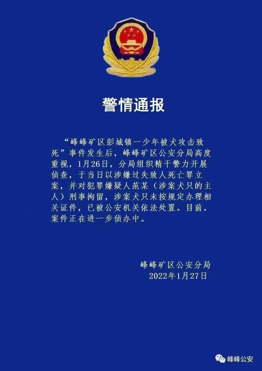 又发生一起恶犬行凶的悲剧。警方通报,1月20日河北邯郸市彭城镇一名12岁男孩被4条犬只咬死,目前该案正在侦查中,涉事的4条犬只及犬主范某已被控制。