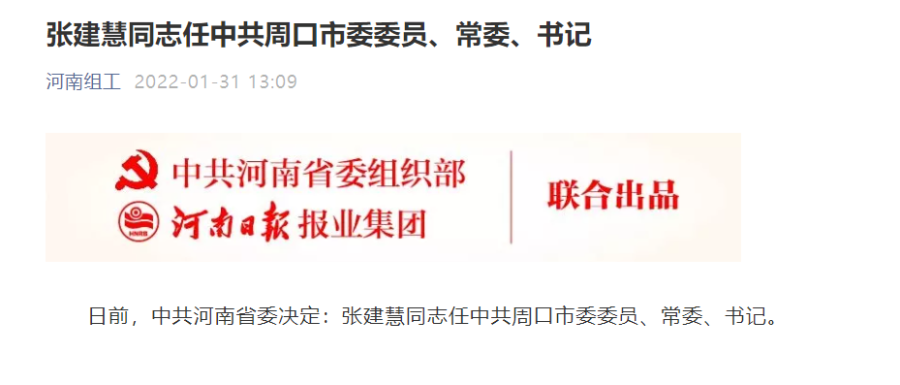 据“河南组工”微信公众号消息,日前,中共河南省委决定:张建慧同志任中共周口市委委员、常委、书记。