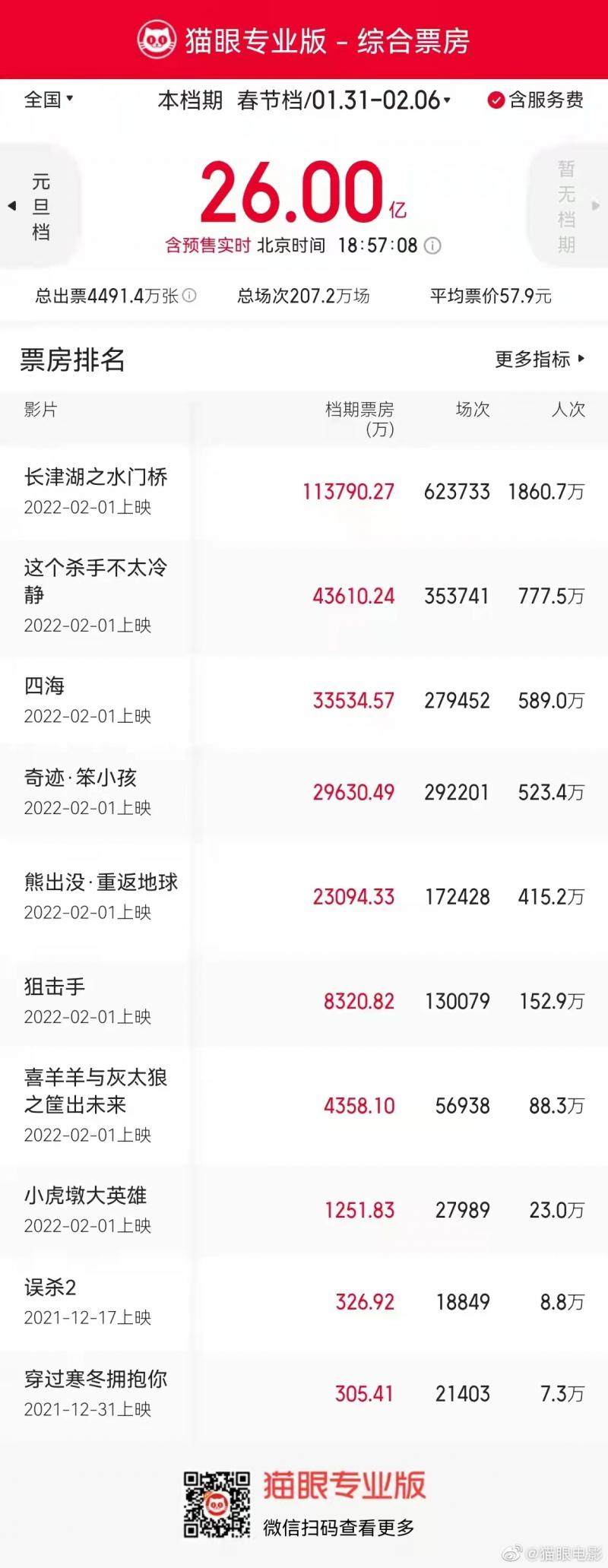 根据猫眼专业版数据显示,2022年2月2日18时57分,2022年春节档总票房(含预售)破26亿。然而,今年春节档票房高歌猛进的同时,票价贵也成为一大热点。