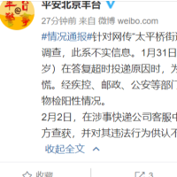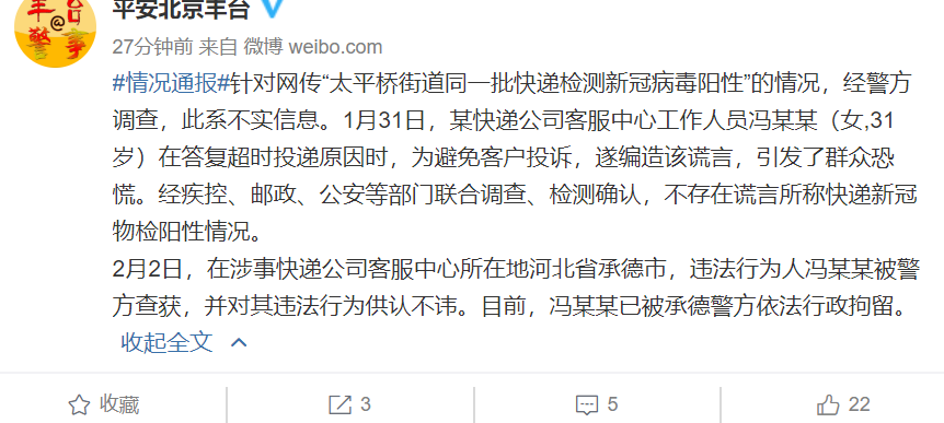 北京丰台警方2月2日晚通报,针对网传“太平桥街道同一批快递检测新冠病毒阳性”的情况,经警方调查,此系不实信息。