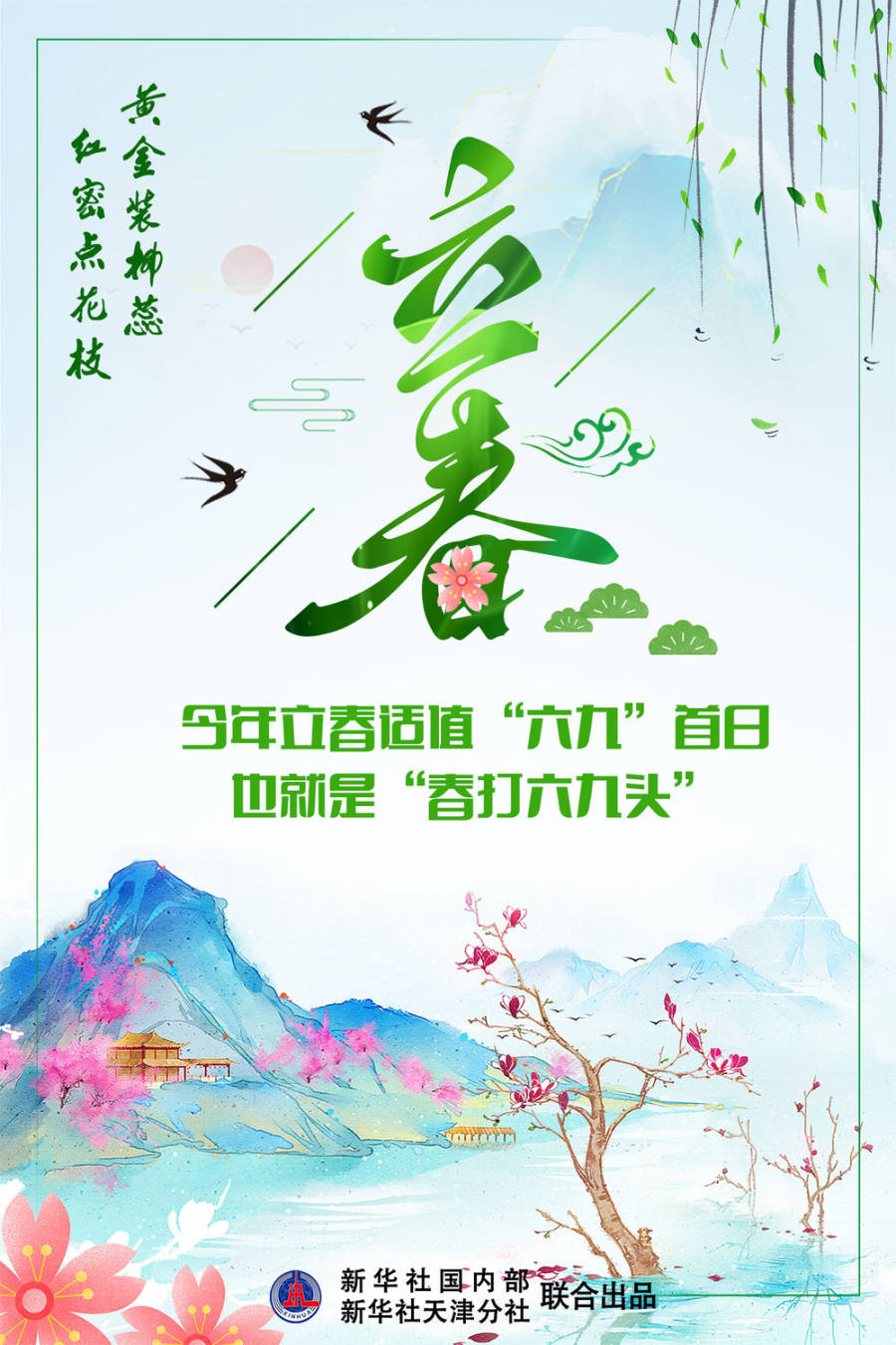 今年立春适值“六九”首日,也就是“春打六九头”。罗澍伟说:“‘五九六九,沿河看柳’。此时节垂柳渐绿,枝抽新芽;远观水岸,‘黄金装柳蕊,红密点花枝’的诱人景色,会徐徐映入眼帘。”