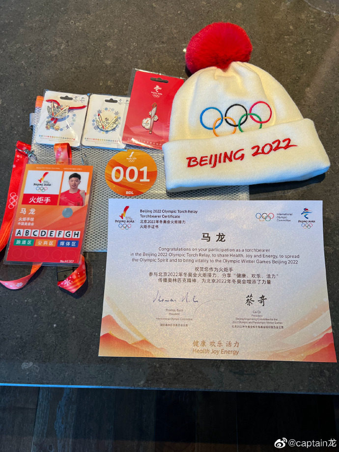 作为八达岭长城的第一棒火炬手,曾获得里约、东京两届奥运会乒乓球男子单打冠军马龙身着印有奥运五环的运动服,高举火炬一边向在场观众挥手,一边向前奔跑。