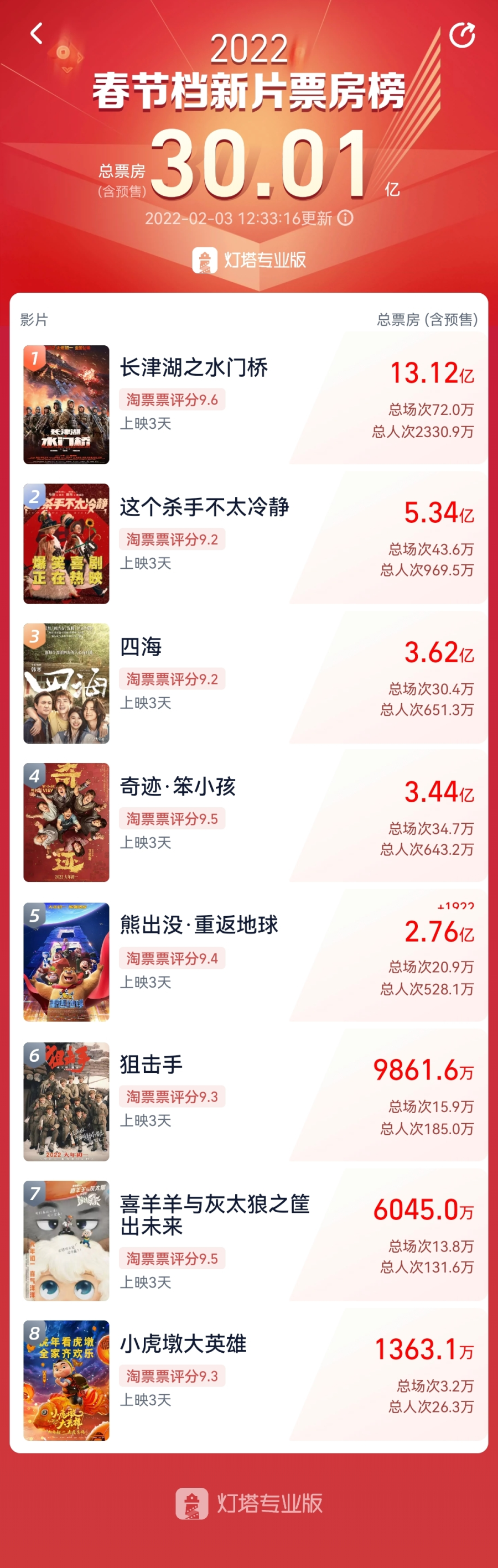 据灯塔专业版显示,截至2月3日12时33分,2022春节档新片(含预售)总票房已突破30亿。