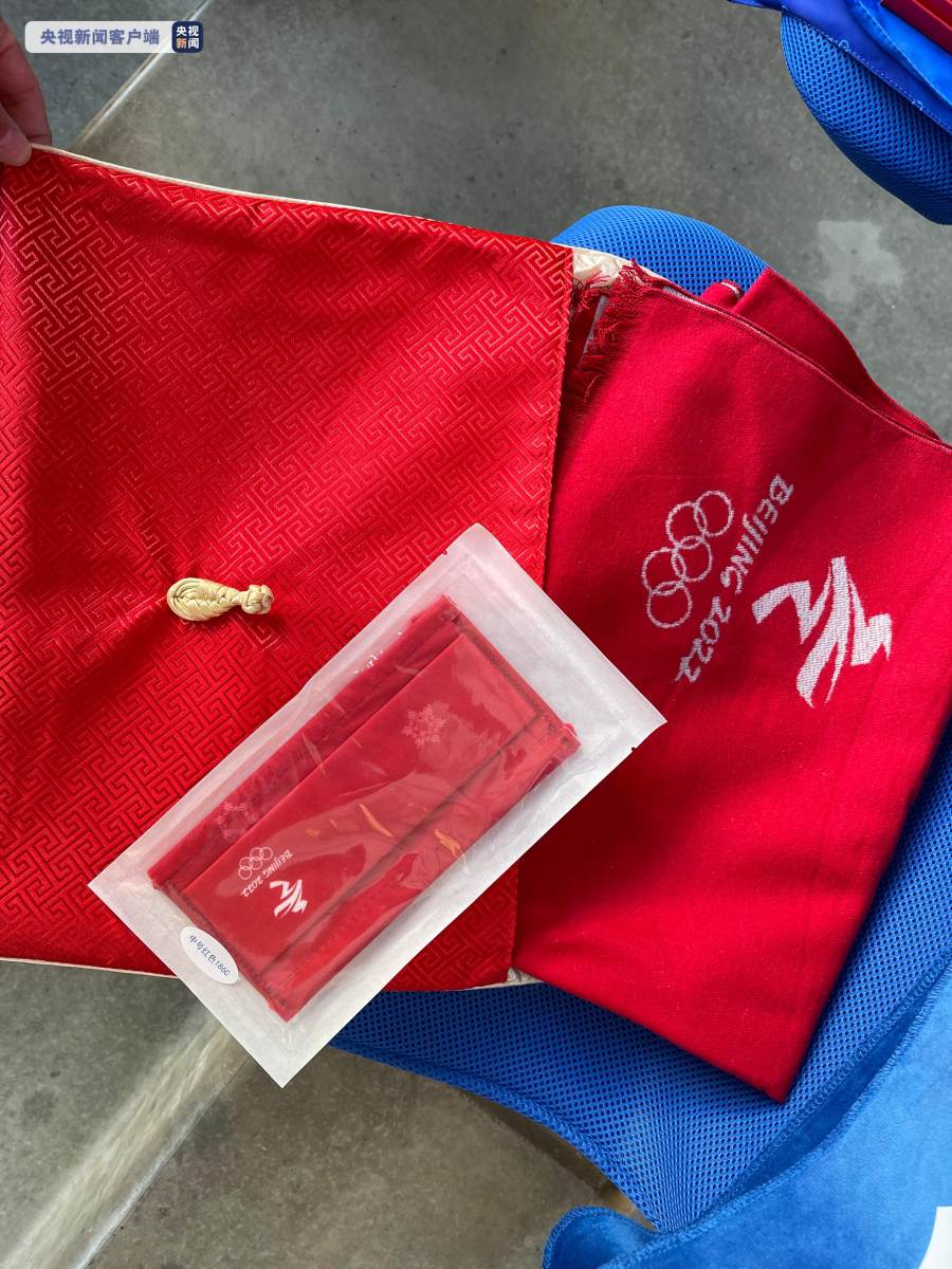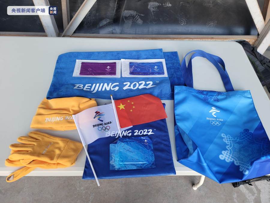 礼包里有国旗和2022冬奥会旗帜各一面;还有用于保暖的帽子、手套、暖宝宝、坐垫盖毯,以及防疫物资口罩和消毒湿巾。