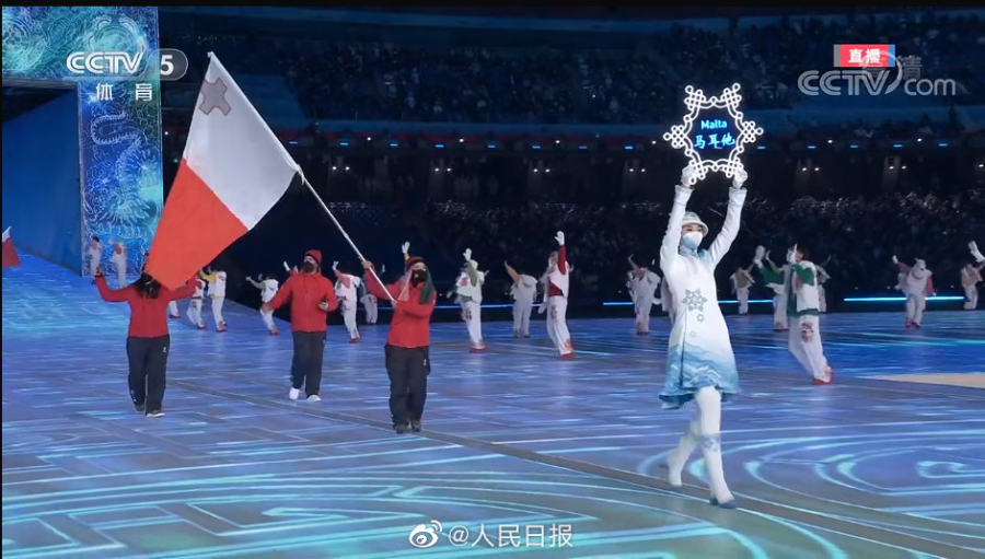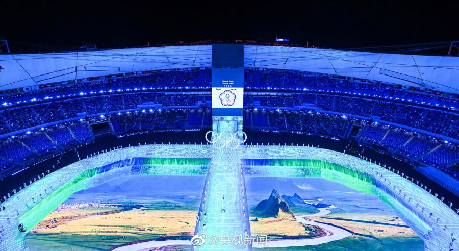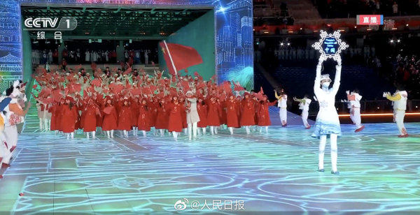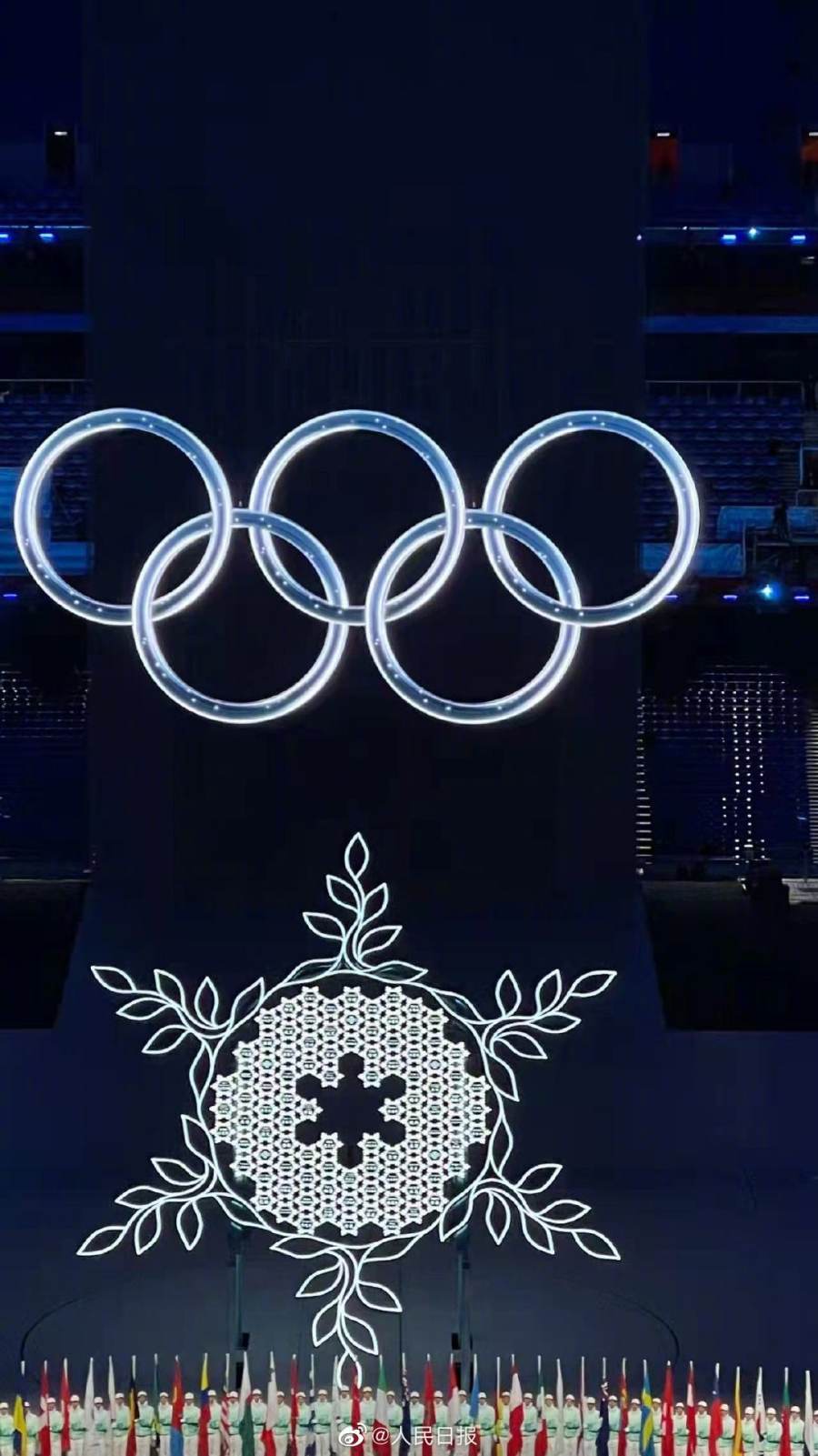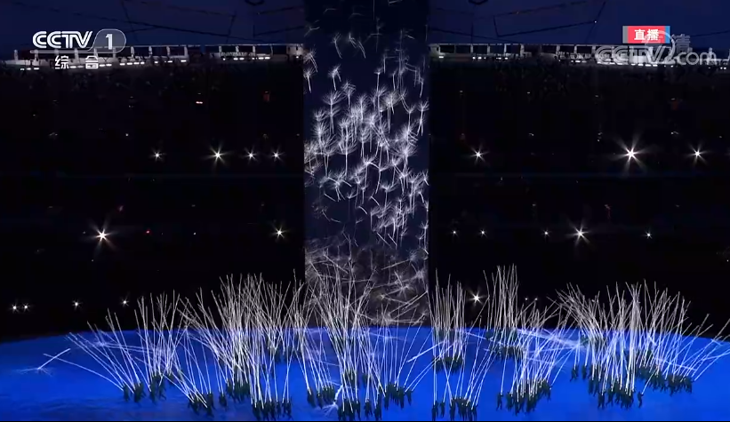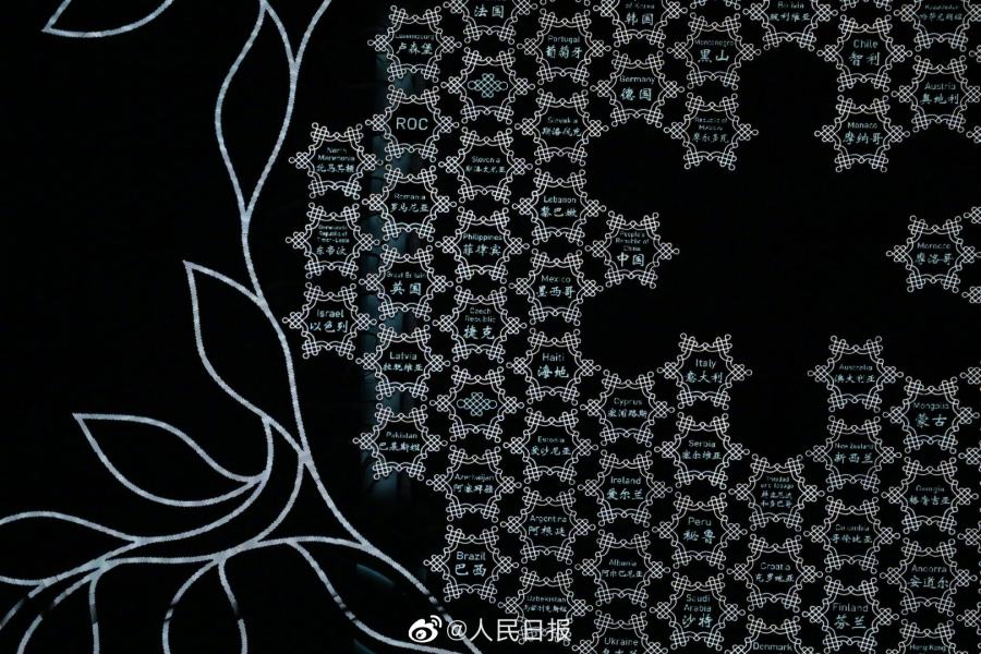 而随着中国代表团的入场,鸟巢里也构建出了一朵大雪花。这朵“大雪花”由全部参赛国家(地区)共同组成,所有国家(地区)名都在其上,以橄榄枝图案造型构成,寓意“协和万邦”。