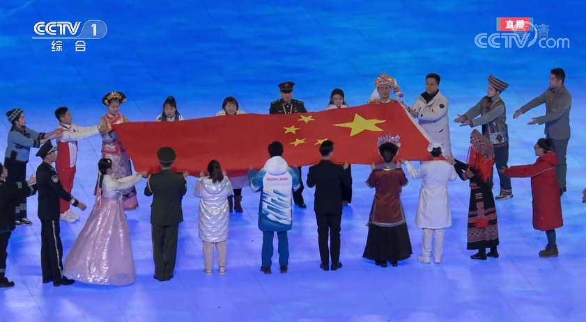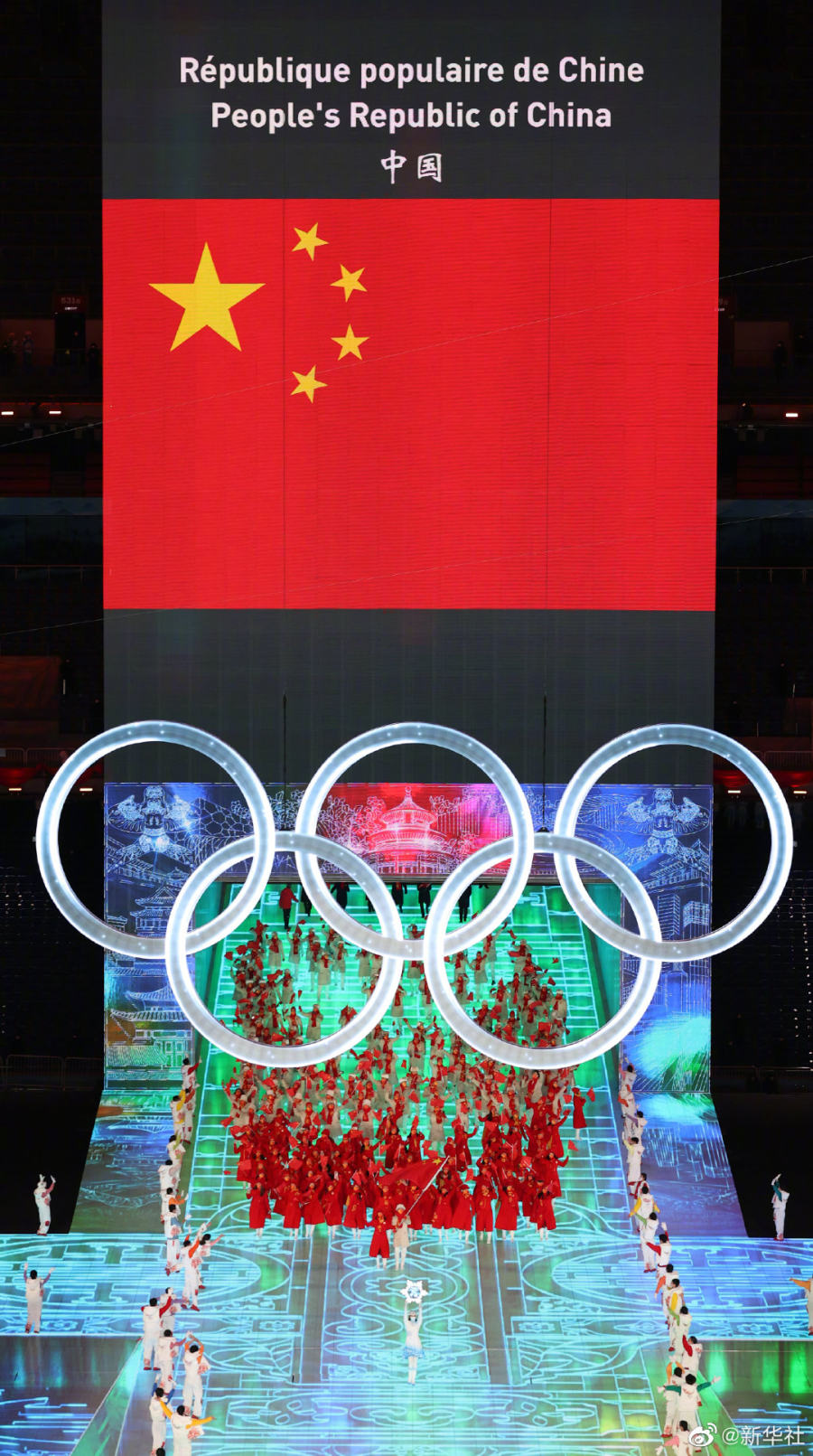 伴随着《歌唱祖国》的乐曲声,两名旗手、钢架雪车运动员赵丹和速度滑冰运动员高亭宇带领中国体育代表团入场。作为东道主,中国体育代表团是北京冬奥会开幕式运动员入场仪式中第91个,也是最后一个入场的代表团。