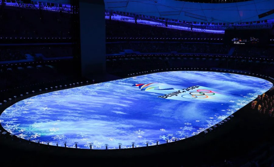 24道激光从高处投射而来,雕刻反转。冰球运动员挥杆击“球”,“冰立方”逐渐碎裂,巨大的冰雪五环从中露出真容,缓缓上升。紧接着,6个冰墩墩共同推开场地正后方的“中国门”……