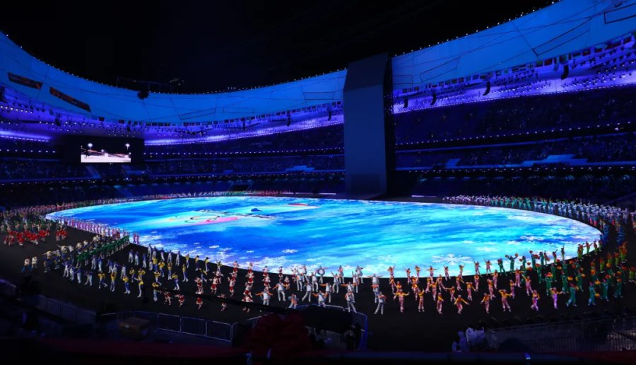 一点水墨滴落,幻化成“黄河之水天上来”的奔腾气象,从鸟巢“碗口”倾泻而下,铺满全场,一方水从中央升起,凝结成晶莹剔透的“冰立方”。