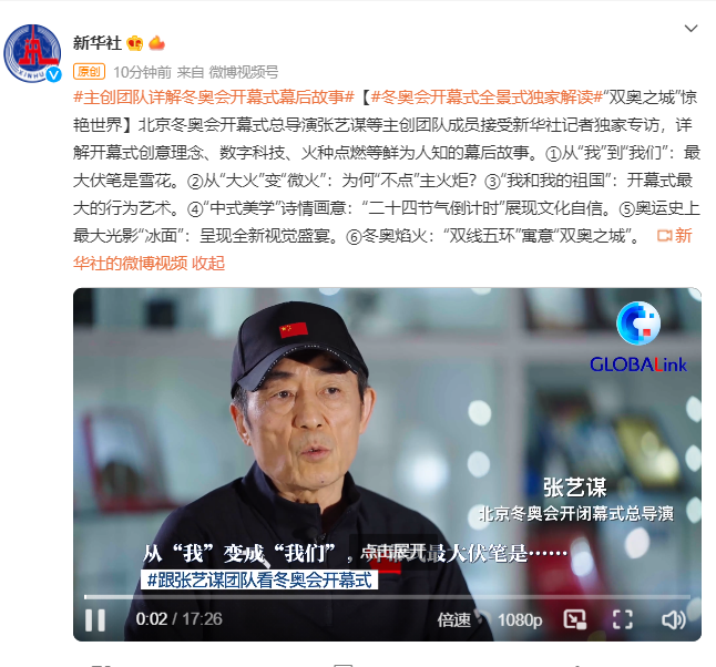 北京冬奥会开幕式总导演张艺谋等主创团队成员接受新华社记者独家专访,详解开幕式创意理念、数字科技、火种点燃等鲜为人知的幕后故事。