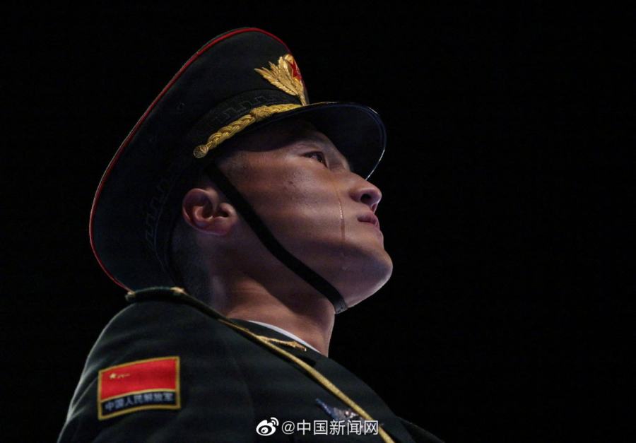 照片中,一位中国军人目光坚定注视前方,眼泪从脸颊滑落,划出一道清澈的泪痕。