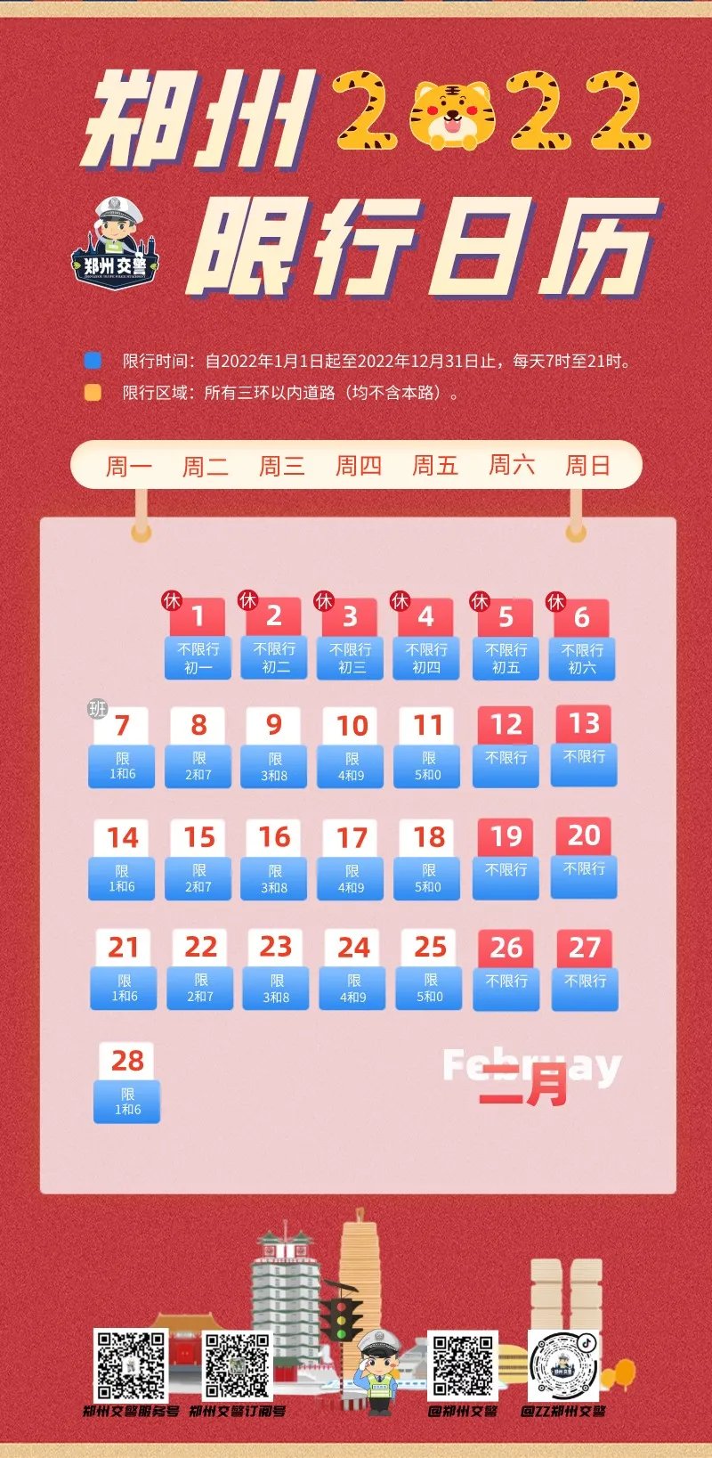 根据郑州交警发布的2月限行日历,郑州明日(2月7日、正月初七)限行尾号1、6。
