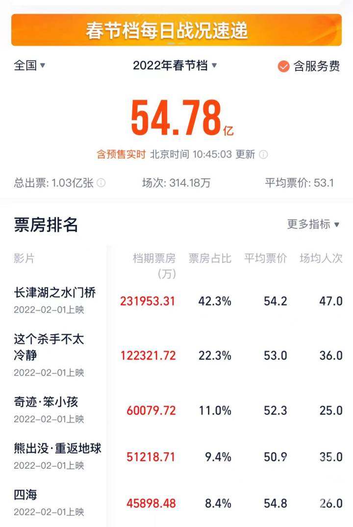 根据灯塔数据,截止到今天10:45,春节档总票房已经突破50亿,达到了54.78亿。而这个数字背后是史上最贵春节档,今年春节档(截至目前)平均票价达到了53.1元,大年初一的平均票价更是高达56.1元,创下了历史高点。