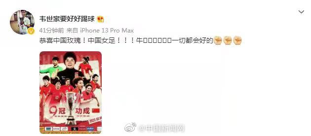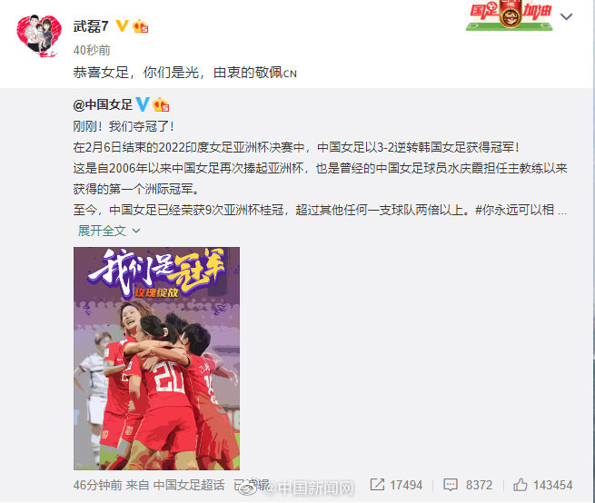 中国女足夺冠亚洲杯后,中国男足国脚武磊、韦世豪等纷纷发文祝贺。武磊表示:“你们是光,由衷的敬佩。”