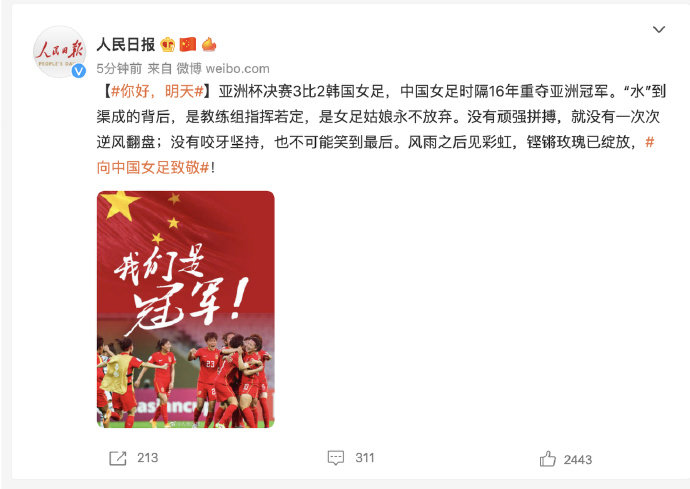 @人民日报 发文:风雨之后见彩虹,向中国女足致敬。