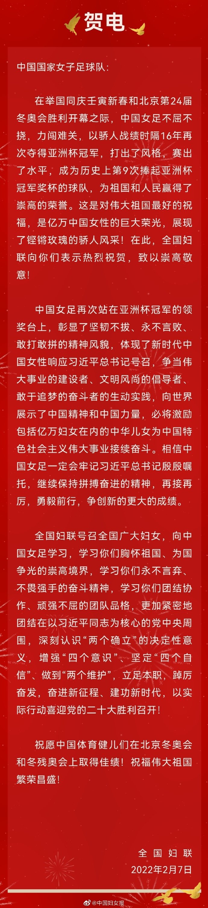 在举国同庆壬寅新春和北京第24届冬奥会胜利开幕之际,中国女足不屈不挠,力闯难关,以骄人战绩时隔16年再次夺得亚洲杯冠军,打出了风格,赛出了水平,成为历史上第9次捧起亚洲杯冠军奖杯的球队,为祖国和人民赢得了崇高的荣誉。这是对伟大祖国最好的祝福,是亿万中国女性的巨大荣光,展现了铿锵玫瑰的骄人风采!在此,全国妇联向你们表示热烈祝贺,致以崇高敬意!