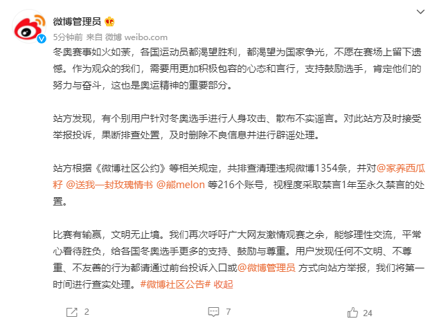 @微博管理员消息,冬奥赛事如火如荼,各国运动员都渴望胜利,都渴望为国家争光,不愿在赛场上留下遗憾。作为观众的我们,需要用更加积极包容的心态和言行,支持鼓励选手,肯定他们的努力与奋斗,这也是奥运精神的重要部分。