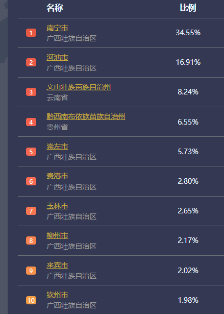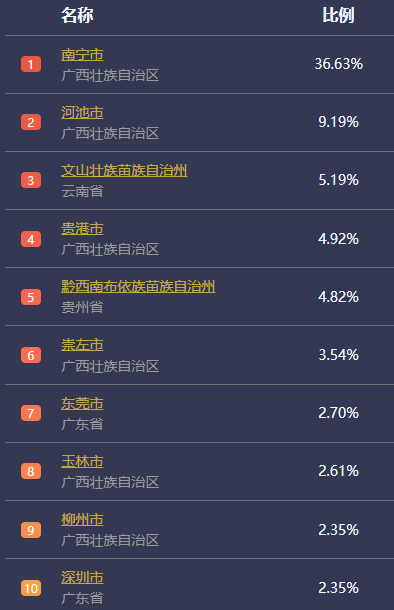 “以2月3日为例,流出迁出前十名目的地城市主要集中在广西和毗邻百色的云南文山州、贵州黔西南州。其中南宁占比达到了34.55%,河池占比为16.91%,云南文山州占比为8.24%,贵州黔西南占比为6.55%。此外,崇左、贵港、玉林、柳州、来宾、钦州分列四到十位。”