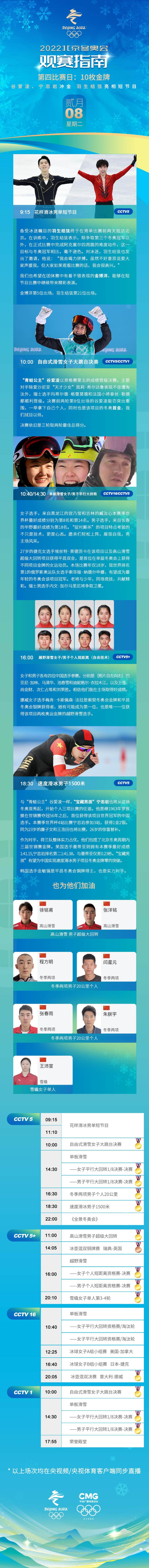 北京冬奥会将在8日产生10枚金牌,代表中国出战的谷爱凌将在自由式滑雪女子大跳台比赛中,冲击自己的首枚冬奥会金牌;实力不俗的小将宁忠岩很有可能在速度滑冰男子1500米决赛中争得奖牌。人气选手、日本花滑明星羽生结弦与中国名将金博洋将亮相男子单人滑短节目。