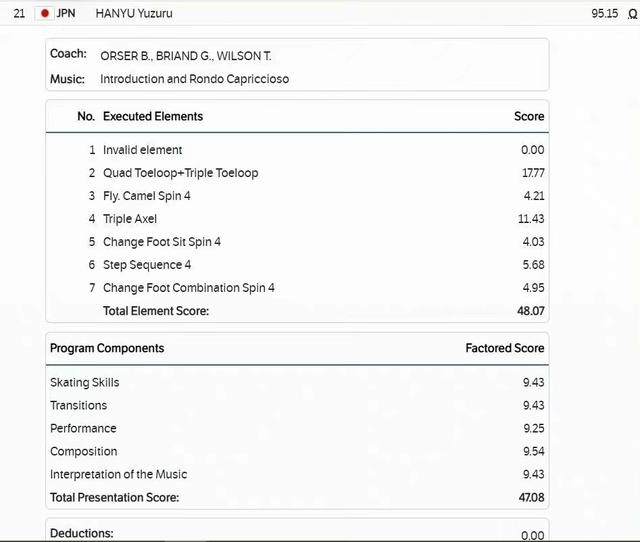 在被问到跳空那一刻的想法时,羽生说:“我和自己说,好吧,这运气可真不好。但就是那么一瞬的事情,因为我必须为下面的动作做准备了。我真的很爱我短节目的音乐,我爱随着这首音乐起舞,而且我没有觉得哪里很差。”