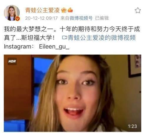 考入斯坦福是谷爱凌的梦想。成绩出来的那天,“打开电脑,我看到第一个字:恭喜!手(一抬)打到自己脸,马上就哭了,因为这个对我来说是最大的愿望之一。”